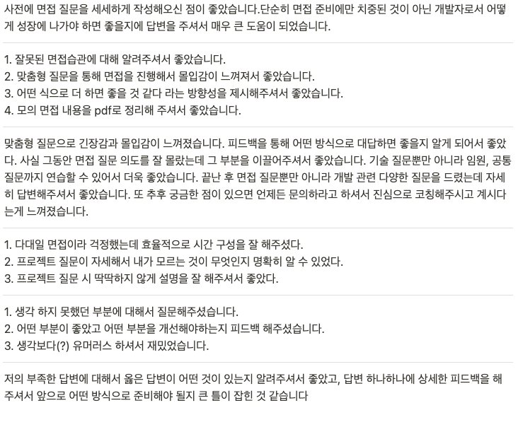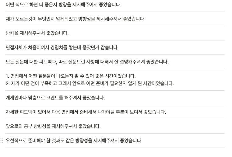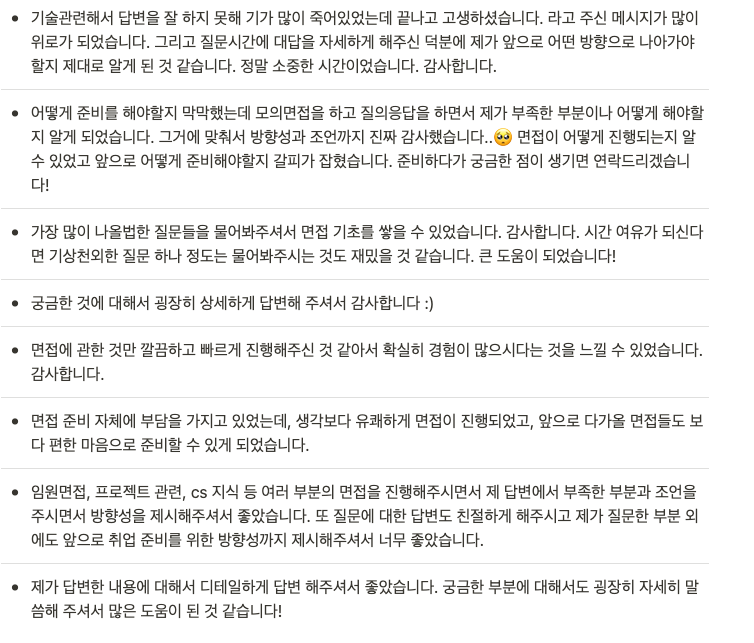 그래서 끝나고 피드백을 면접에서 부족했던 점이라던가, 면접 태도라던가, 공부 방향, 취업을 위해서 무엇을 중점적으로 해야하는지를 피드백을 드렸습니다