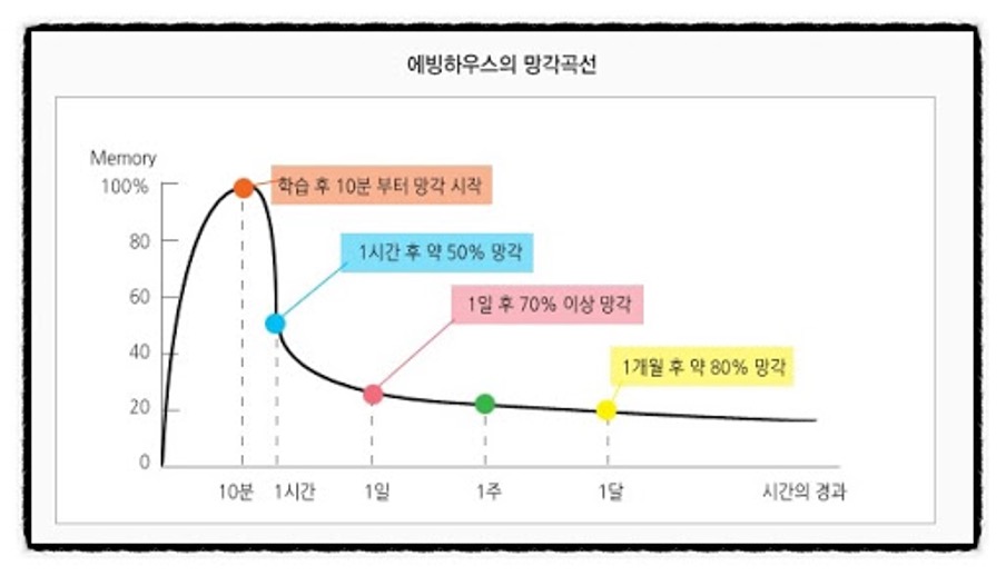 에빙하우스 망각곡선에 따르면 사람의 기억은 24시간이 지나면 기억의 70퍼를 넘게 잊어버립니다!