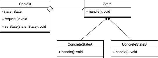 - State 인터페이스는 각 상태에서 구현해야 할 handle() 메서드를 정의하고, 구체적인 상태 클래스인 ConcreteStateA와 ConcreteStateB는 각각 상태에 맞는 특정 동작을 구현합니다. 클라이언트는 Context를 통해 상태를 설정하고 해당 상태에서의 동작을 호출할 수 있습니다.